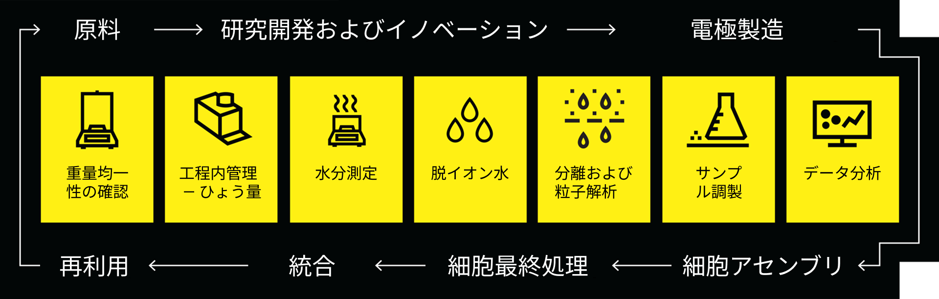 ザルトリウス社は、材料純度測定や工程内最適化から最終出荷に至るまで、充電式バッテリー製造プロセスの複数の工程に対応するソリューションを提供しております。直感的な実験室用ツールと統合型計量ソリューションに加え、多変量データ解析技術によりさらに強化されたソリューションです。