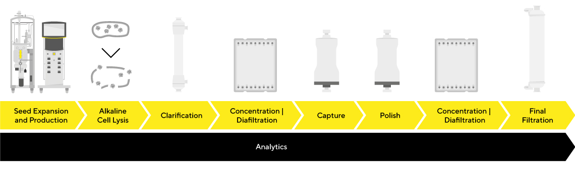 目的の遺伝子はプラスミドDNA(pDNA)に挿入され、形質転換と呼ばれるプロセス(通常は電気穿孔法による)で宿主細菌(一般的に大腸菌)に導入されます。宿主細胞は培養過程で増殖し、プラスミドの複製を行うことで目的配列を高収量で生成します。細胞が所定の密度に達すると、細胞のハーベストが行われ、通常アルカリ溶解法によりpDNAが抽出されます。その後、溶解液を清澄化し、クロマトグラフィーを用いてpDNAを精製します。最後に、プラスミドを濃縮・フィルターした後、品質管理措置を実施し、製品の十分な純度を確保します。